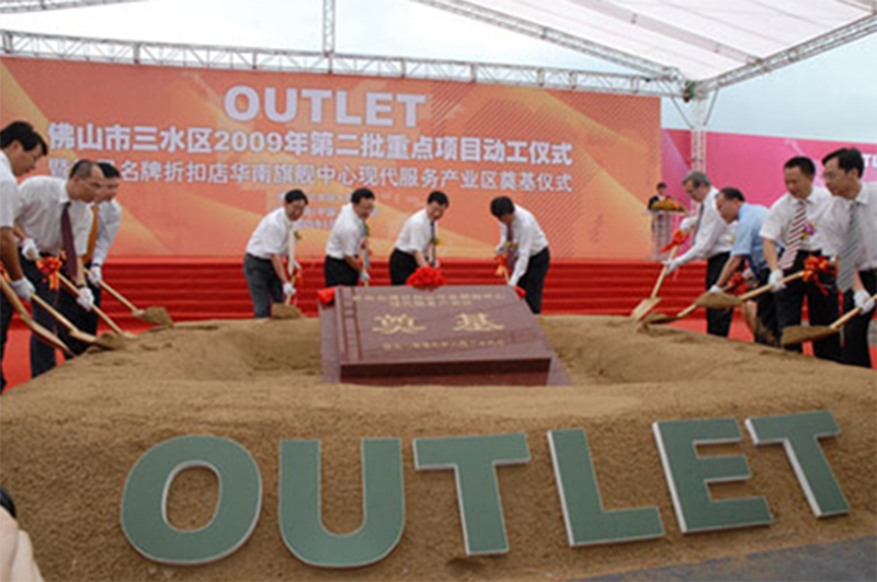 2009年6月28日,廣東省新十項(xiàng)工程重點(diǎn)項(xiàng)目奧特萊斯華南現(xiàn)代服務(wù)產(chǎn)業(yè)區(qū)在廣東佛山三水區(qū)舉行隆重奠基儀式,中國(guó)商業(yè)聯(lián)合會(huì)會(huì)長(zhǎng)何濟(jì)海先生和佛山市市委書(shū)記林元和先生出席儀式,并為項(xiàng)目培土奠基。