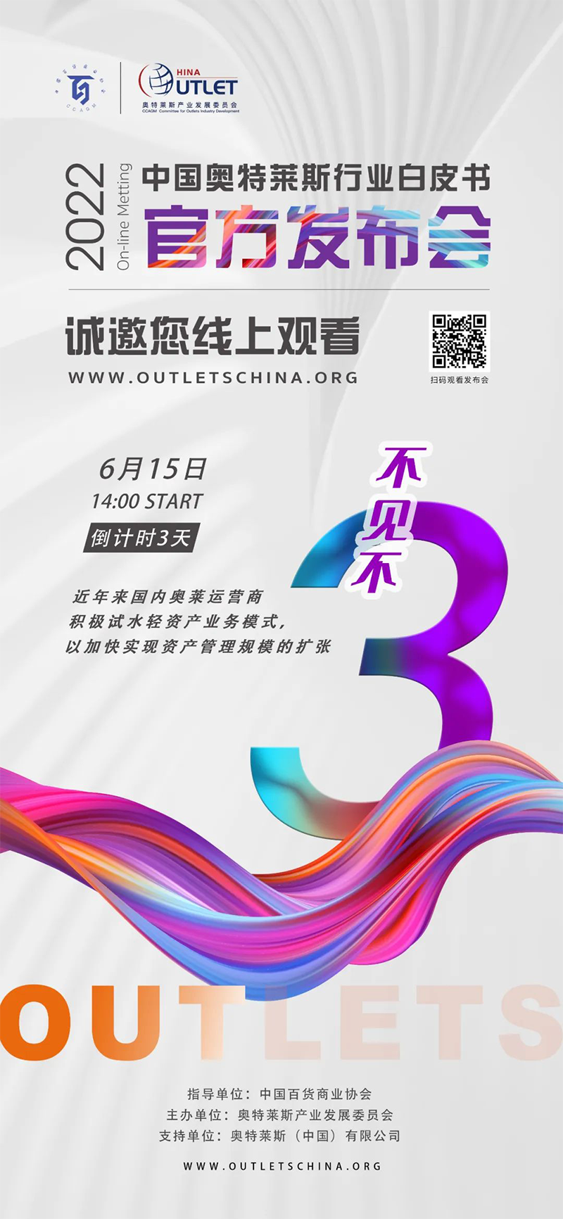2022年6月15日14:00,《2022年中國奧特萊斯行業(yè)白皮書》線上發(fā)布會即將正式開始,本次發(fā)布會,將對國內(nèi)零售市場及奧萊產(chǎn)業(yè)引入中國20年發(fā)展的經(jīng)驗及機(jī)遇做出全新解讀。